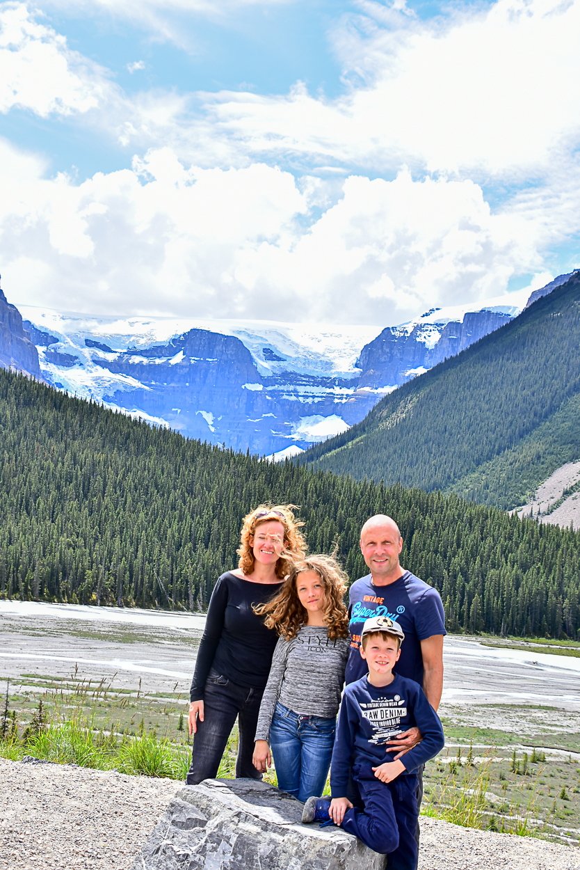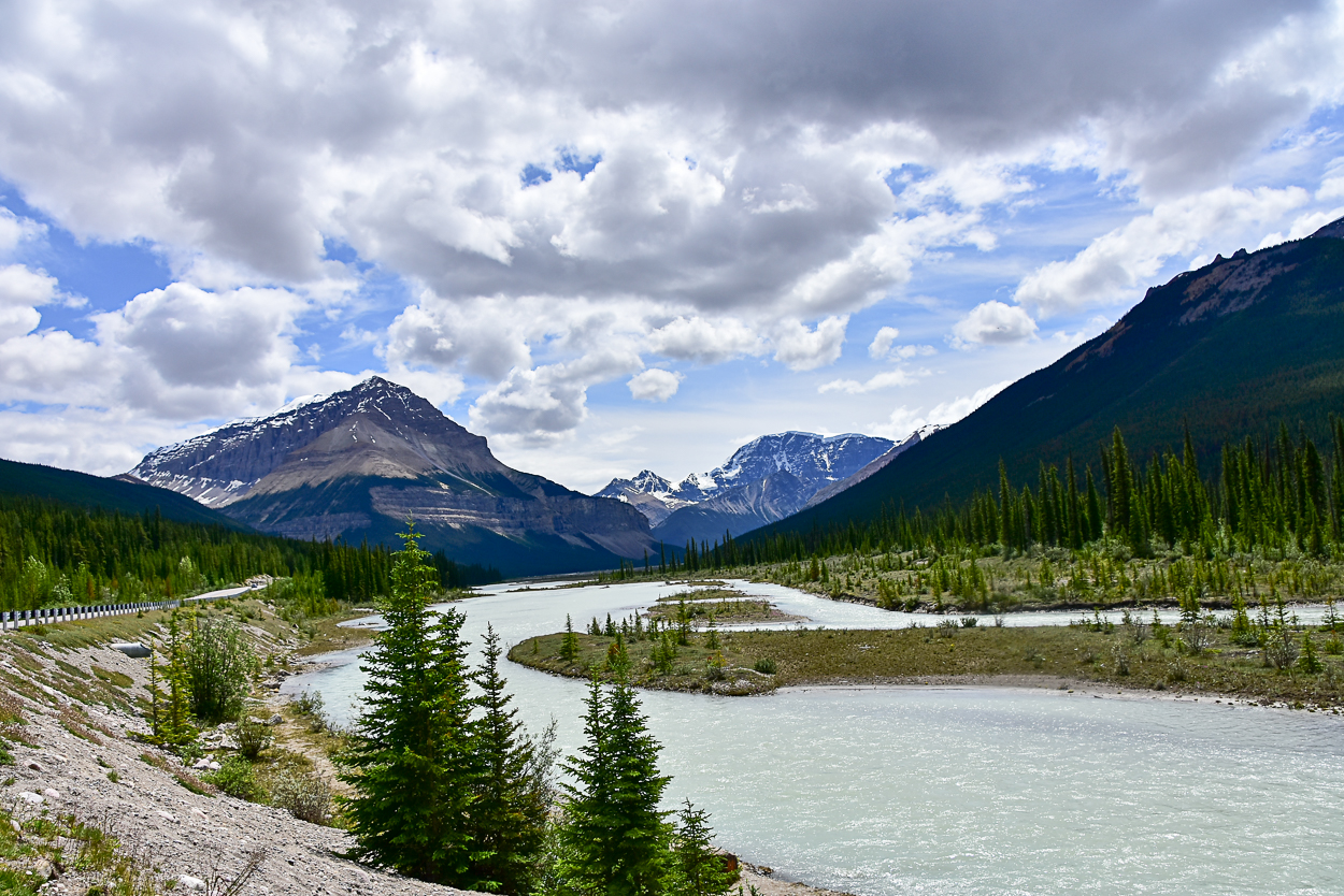 We stoppen kort bij een mooi uitkijkpunt, dan de eerste echte stop bij de Athabasca Falls. Het weer is raar buitjes, zon, kou, warmer…. Hier is het eerst lekker, dan weer regen maar wel leuke foto’s. Dan weer verder, de Icefields Parkway is een prachtige route! We stoppen regelmatig voor de mooie uitzichten. De volgende langere stop is bij Sunwapta Falls. Hier lunchen we eerst want het regent flink, na de lunch is het beter.