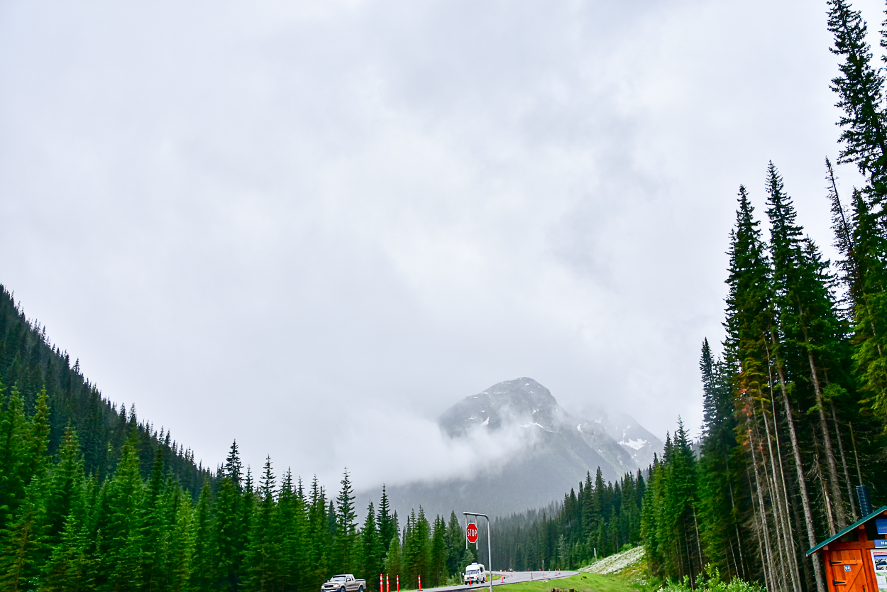 We slapen redelijk uit, voel me weer wat beter, nog niet top. Vandaag beginnen we natuurlijk met koffie ? in Golden. Het plan is verder om vandaag naar Glacier National Park te rijden. Het weer voorspelt helaas niet veel goeds. Yep we rijden van bui naar bui. We zien denk ik maar de helft door alle bewolking, jammer zeg. We lunchen ergens op een rest area met de noedels van gisteren en een top sandwich. Hopen dat het wat gaat opklaren. Dat gebeurd niet, pffff, dan maar door naar Revelstoke via het Revelstoke National Park. Eenmaal in het plaatsje is het in ieder geval droog, daar drinken we wat op het terrasje maar dan begint het daar ook te regenen. Het is een nogal nat dagje!